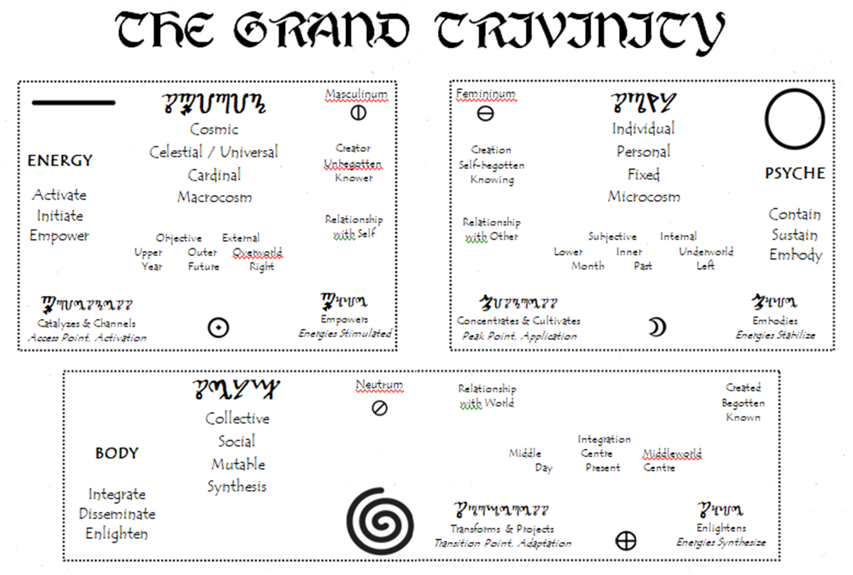 The Goddess now knew Herself in rest and motion; from within and from without; as both Source and Spirit. This consciousness birthed the dyad, creating duality and partnership. From this sacred duality came all of creation, forming the Trivinity.