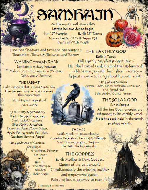 Samhain is often referred to as the Witch’s New Year. What this actually means is the Spiritual New Year. As with the Blood Mysteries – where we start in the blood – the spiritual new year starts in the dark. This is the time when the compost of the previous years, endings, and deaths is made fertile.